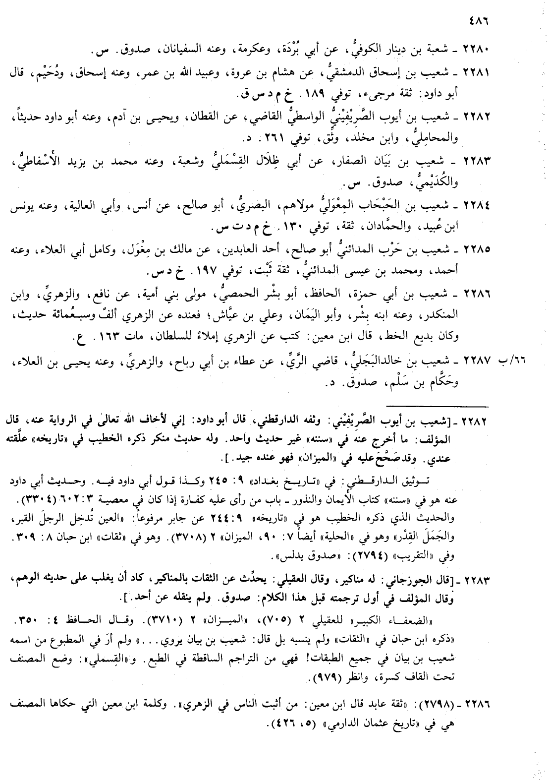 2285- شعيب بن حرب المدائني أبو صالح أحد العابدين عن مالك بن مغول وكامل أبي العلاء وعنه أحمد ومحمد بن عيسى المدائني ثقة ثبت توفي 197 خ د س