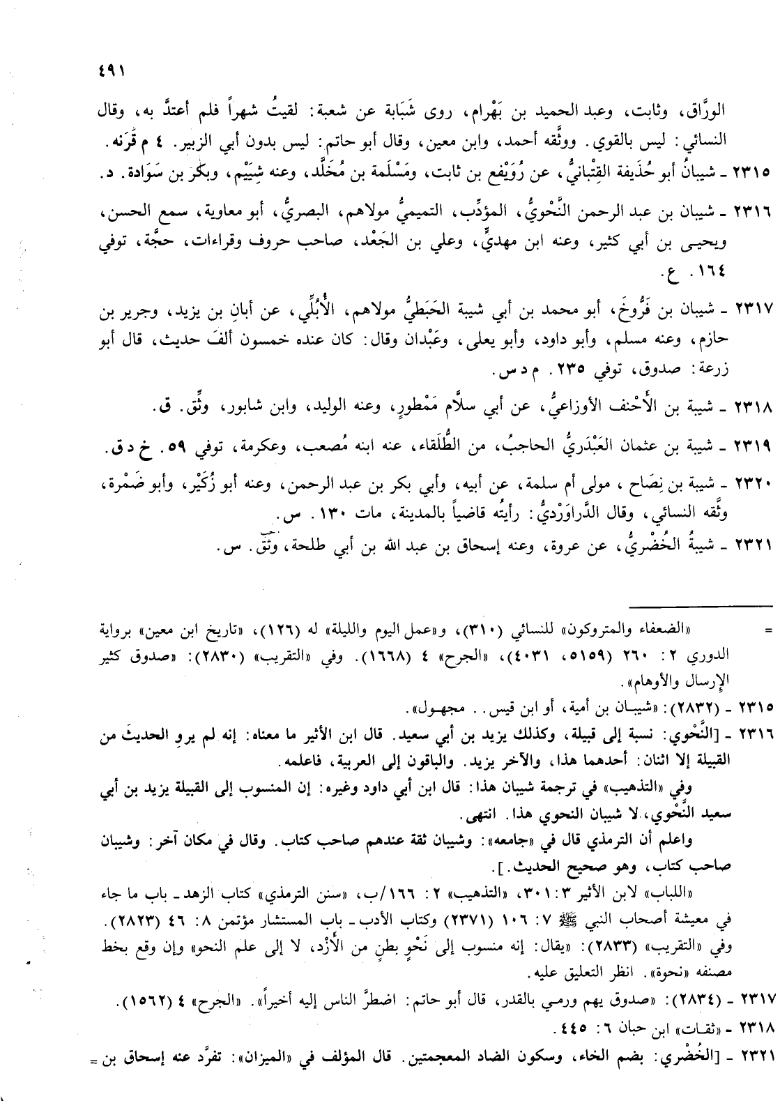 2316- شيبان بن عبد الرحمن النحوي المؤدب التميمي مولاهم البصري أبو معاوية سمع الحسن ويحيى بن أبي كثير وعنه بن مهدي وعلي بن الجعد صاحب حروف وقراءات حجة توفي 164 ع