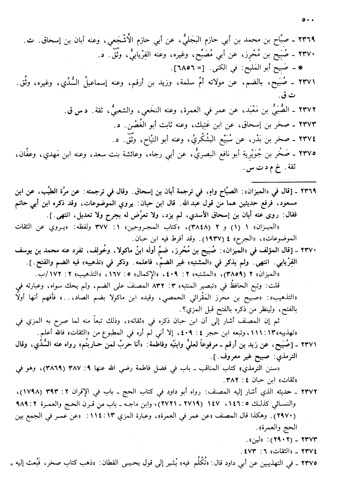 2371- صبيح بالضم عن مولاته أم سلمة وزيد بن أرقم وعنه إسماعيل السدي وغيره وثق ت ق