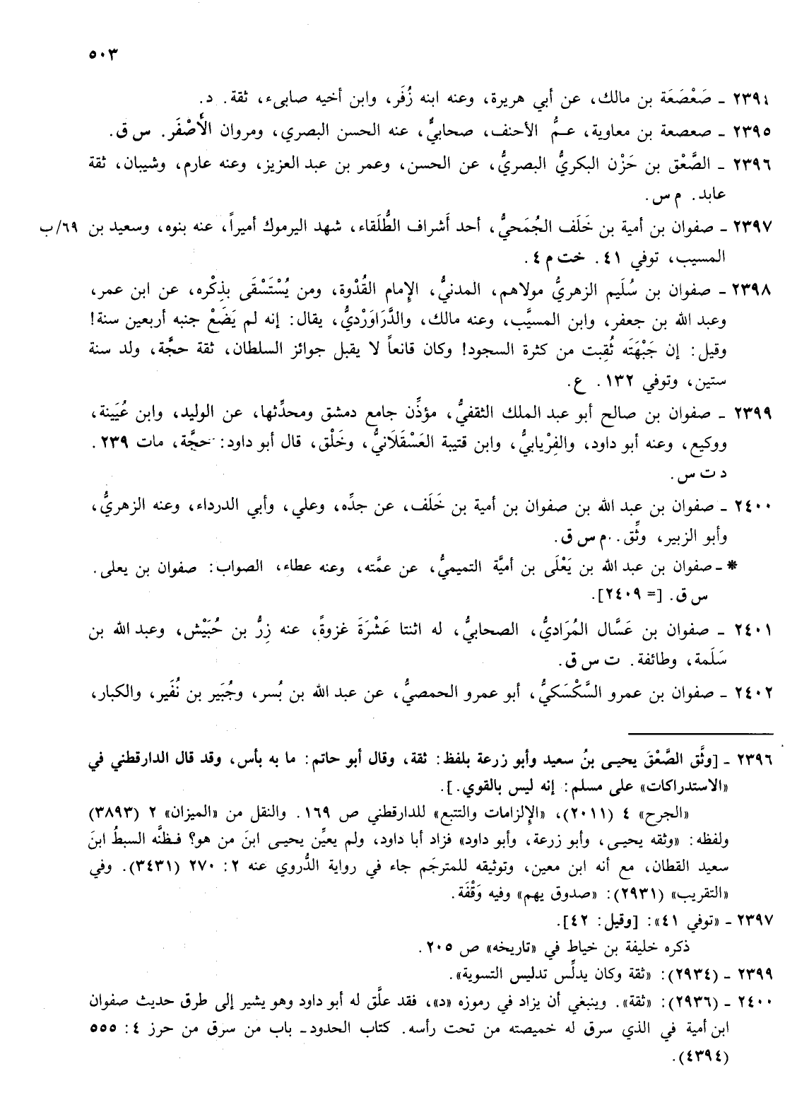 2397- صفوان بن أمية بن خلف الجمحي أحد أشراف الطلقاء شهد اليرموك أميرا عنه بنوه وسعيد بن المسيب توفي 41 خت م 4