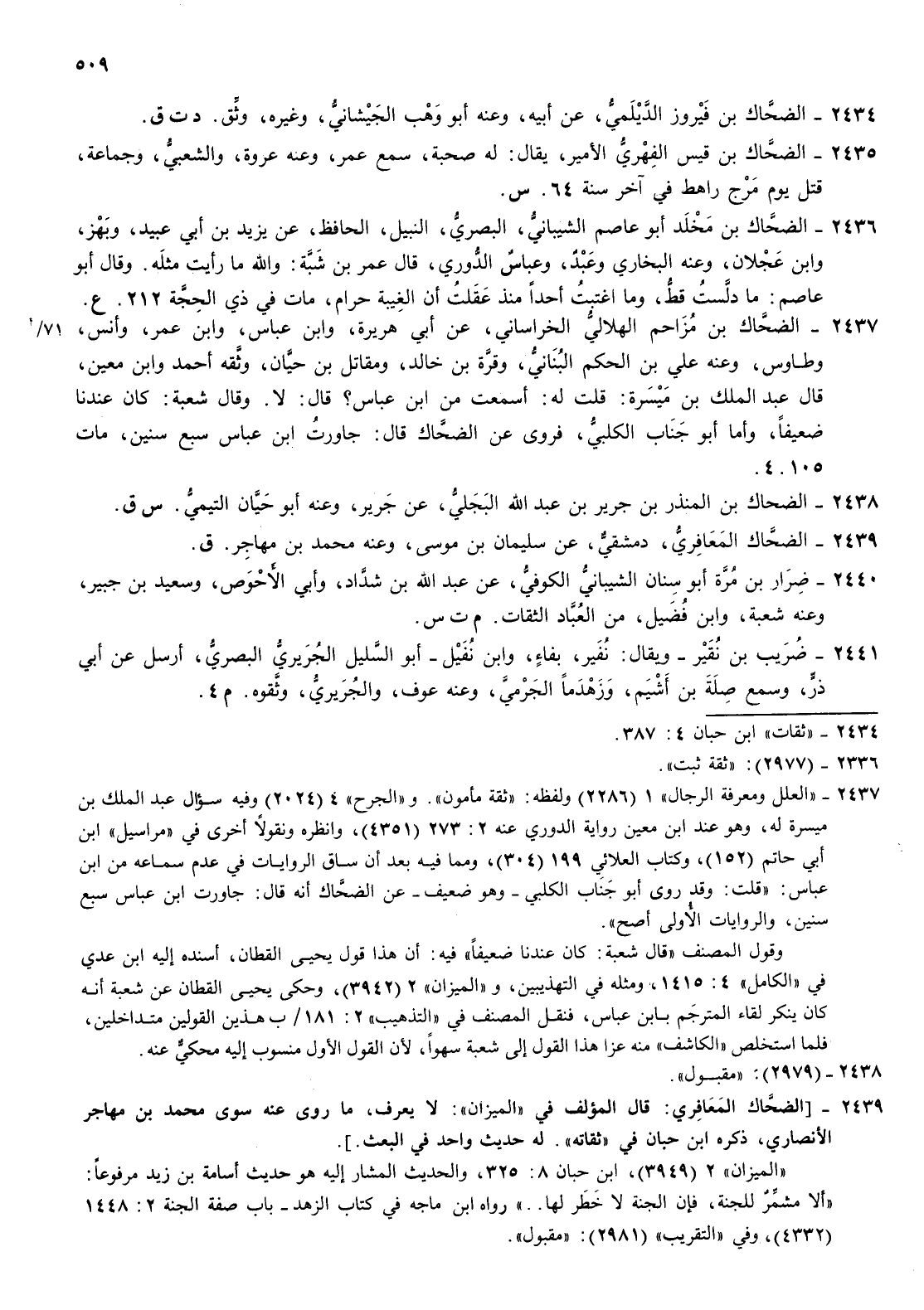 2437- الضحاك بن مزاحم الهلالي الخراساني عن أبي هريرة وابن عباس وابن عمر وأنس وطاوس وعنه علي بن الحكم البناني وقرة بن خالد ومقاتل بن حيان وثقه أحمد وابن معين قال عبد الملك بن ميسرة قلت له أسمعت من بن عباس قال لا وقال شعبة كان عندنا ضعيفا وأما أبو جناب الكلبي فروى عن الضحاك قال جاورت بن عباس سبع سنين مات 105.