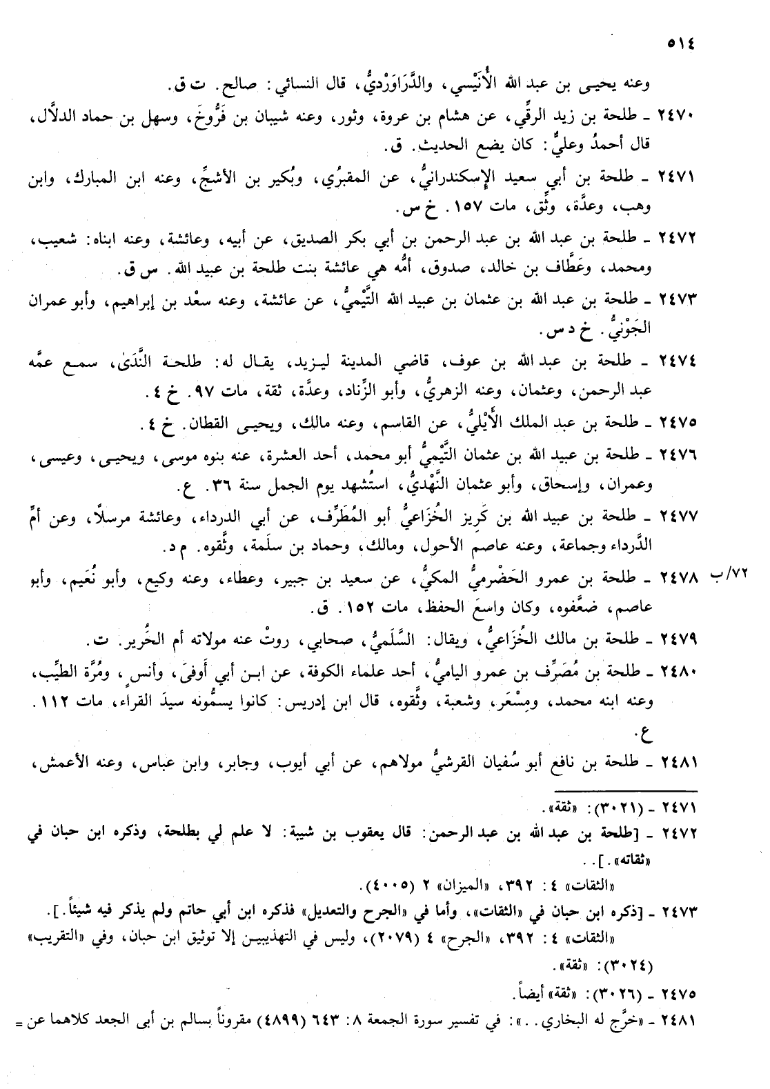 2472- طلحة بن عبد الله بن عبد الرحمن بن أبي بكر الصديق عن أبيه وعائشة وعنه ابناه شعيب ومحمد وعطاف بن خالد صدوق أمه هي عائشة بنت طلحة بن عبيد الله س ق