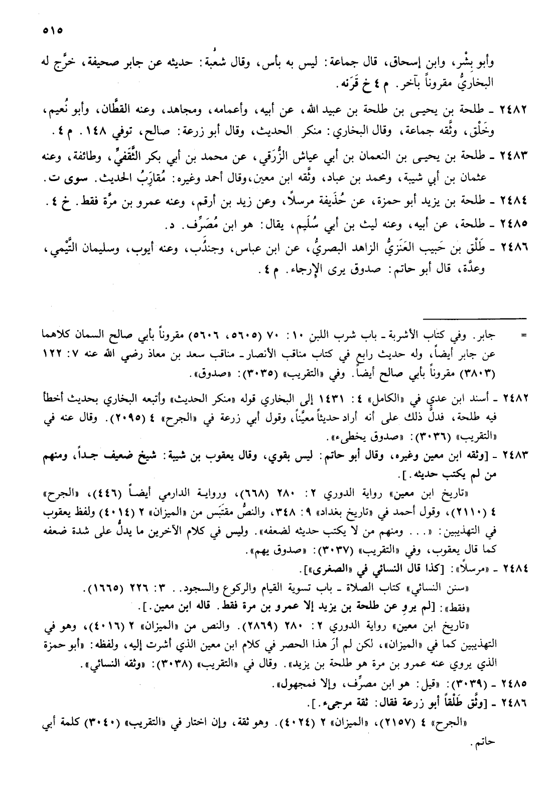 2482- طلحة بن يحيى بن طلحة بن عبيد الله عن أبيه وأعمامه ومجاهد وعنه القطان وأبو نعيم وخلق وثقه جماعة وقال البخاري منكر الحديث وقال أبو زرعة صالح توفي 148 م 4