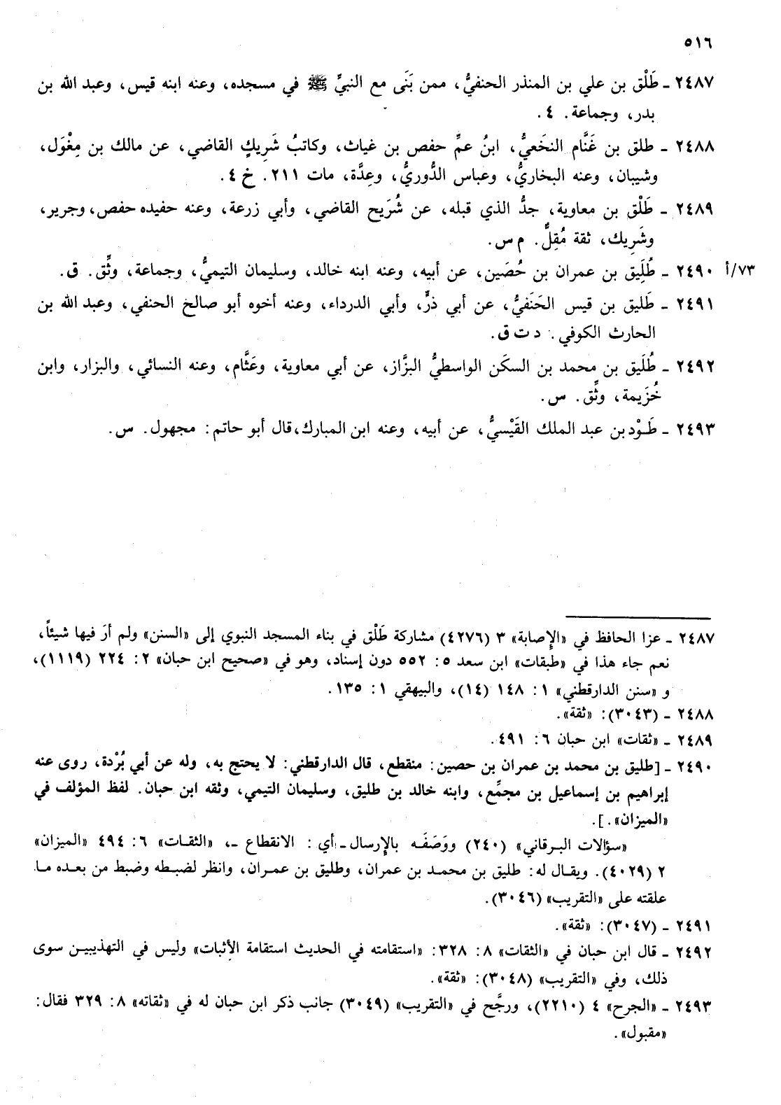2487- طلق بن علي بن المنذر الحنفي ممن بنى مع النبي صلى الله عليه وسلم في مسجده وعنه ابنه قيس وعبد الله بن بدر وجماعة 4