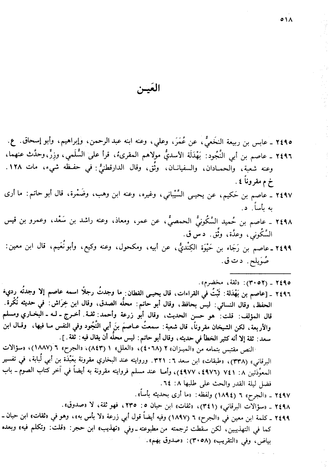 2496- عاصم بن أبي النجود بهدلة الاسدي مولاهم المقرئ قرأ على السلمي وزر وحدث عنهما وعنه شعبة والحمادان والسفيانان وثق وقال الدارقطني في حفظه شئ مات 128
