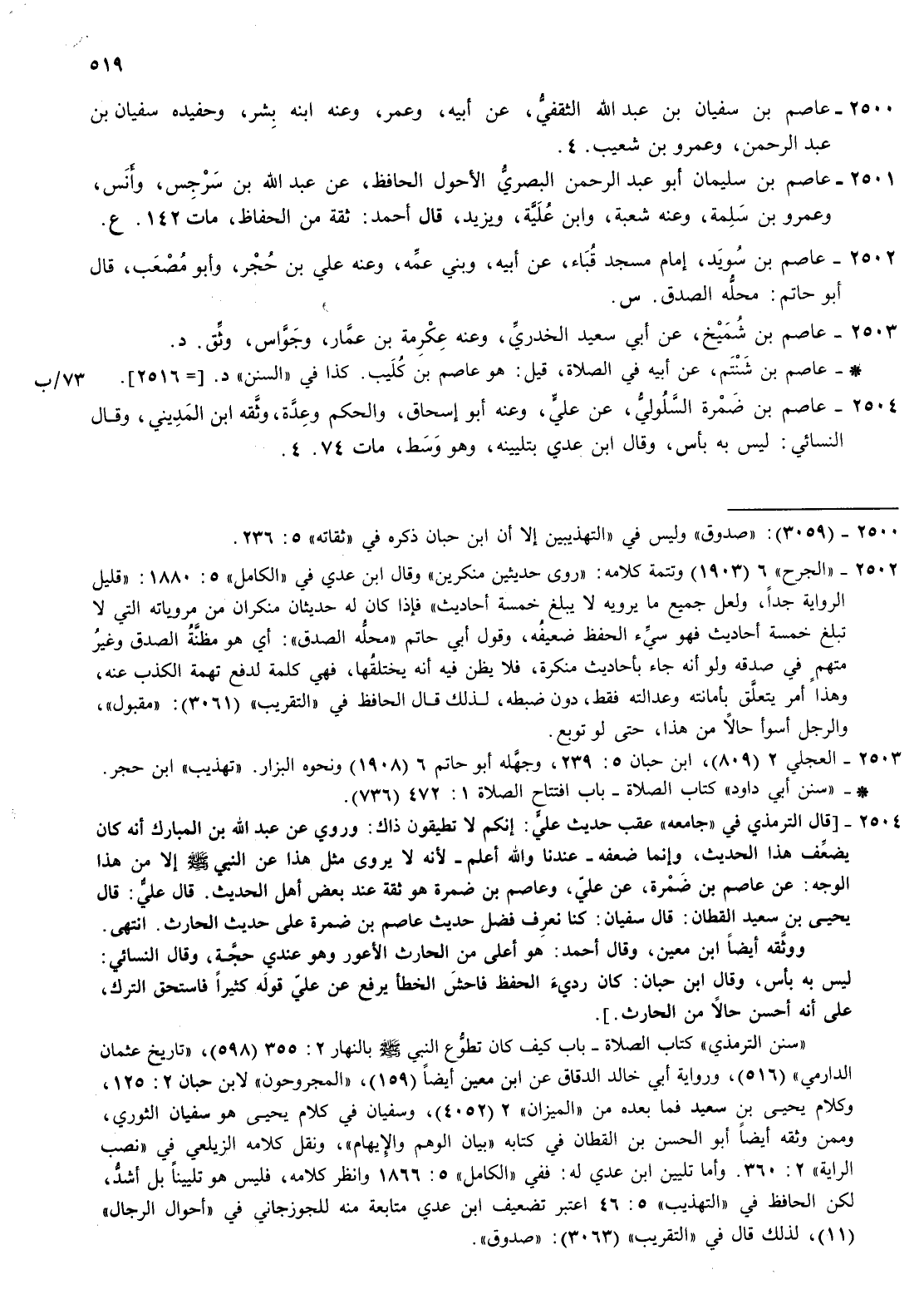 2504- عاصم بن ضمرة السلولي عن علي وعنه أبو إسحاق والحكم وعدة وثقه بن المديني وقال النسائي ليس به بأس وقال بن عدي بتليينه وهو وسط مات 74.