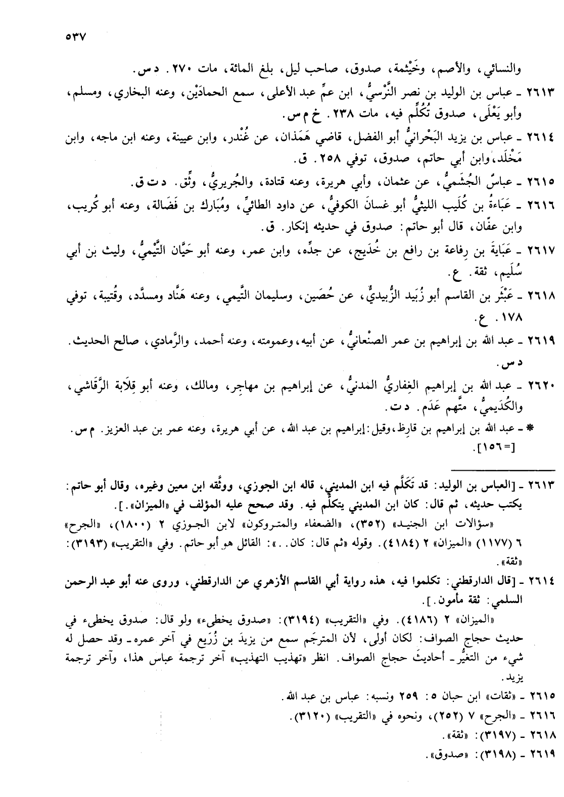 2614- عباس بن يزيد البحراني أبو الفضل قاضي همذان عن غندر وابن عيينة وعنه بن ماجة وابن مخلد وابن أبي حاتم صدوق توفي 258 ق