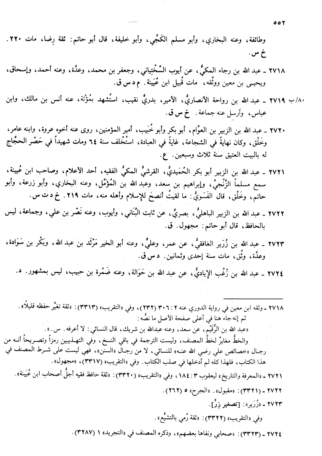 2720- عبد الله بن الزبير بن العوام أبو بكر وأبو خبيب أمير المؤمنين روى عنه أخوه عروة وابنه عامر وخلق وكان نهاية في الشجاعة غاية في العبادة استخلف سنة 64 ومات شهيدا في حصر الحجاج له بالبيت العتيق سنة ثلاث وسبعين ع