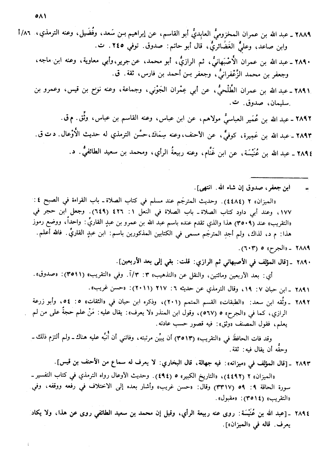 2889- عبد الله بن عمران المخزومي العابدي أبو القاسم عن إبراهيم بن سعد وفضيل وعنه الترمذي وابن صاعد وعلي الغضائري قال أبو حاتم صدوق توفي 245 ت