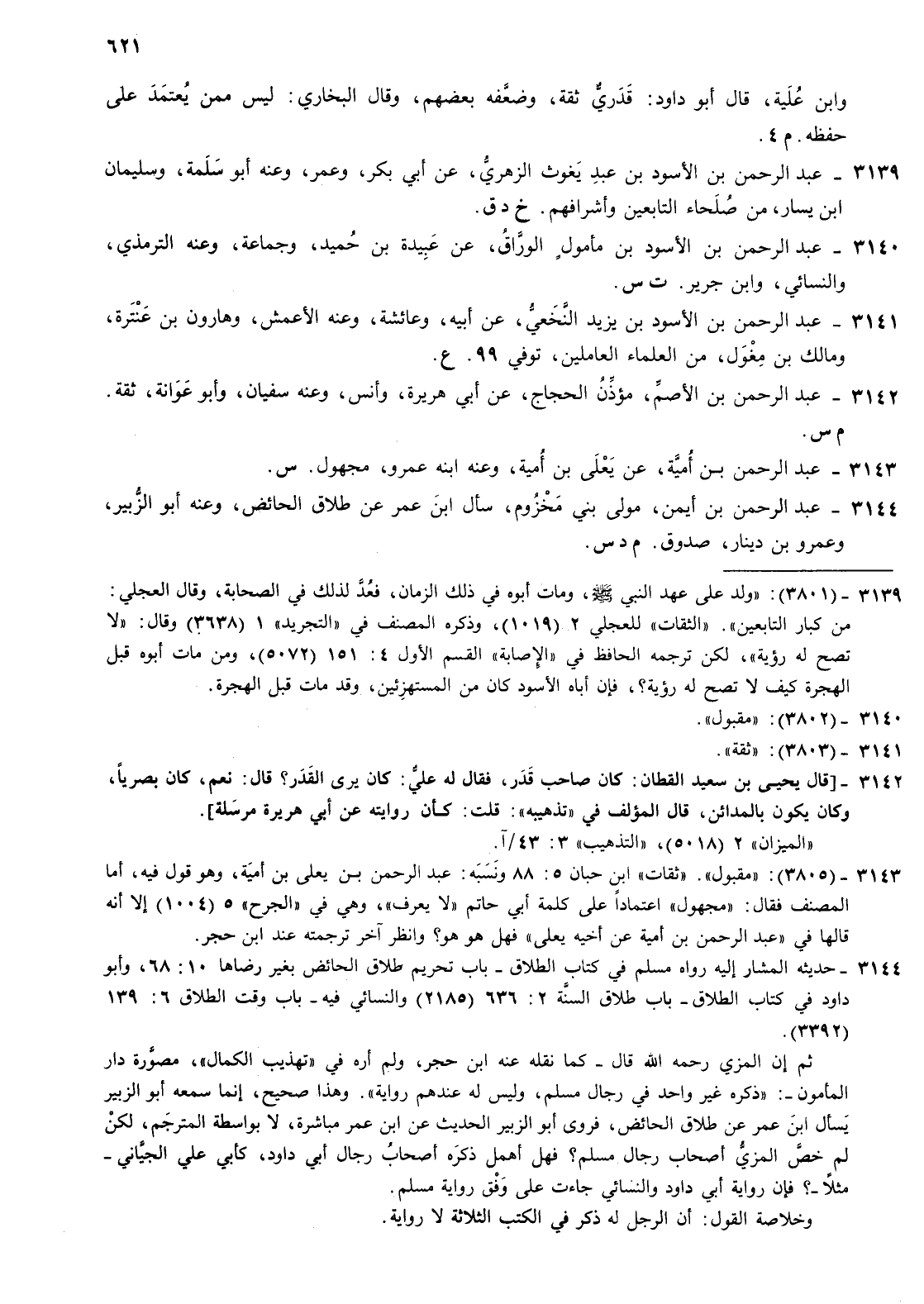3141- عبد الرحمن بن الاسود بن يزيد النخعي عن أبيه وعائشة وعنه الاعمش وهارون بن عنترة ومالك بن مغول من العلماء العاملين توفي 99 ع