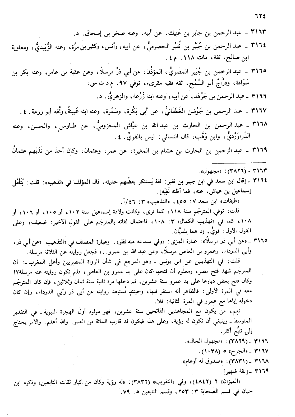 3164- عبد الرحمن بن جبير بن نفير الحضرمي عن أبيه وأنس وكثير بن مرة وعنه الزبيدي ومعاوية بن صالح ثقة مات 118 م 4