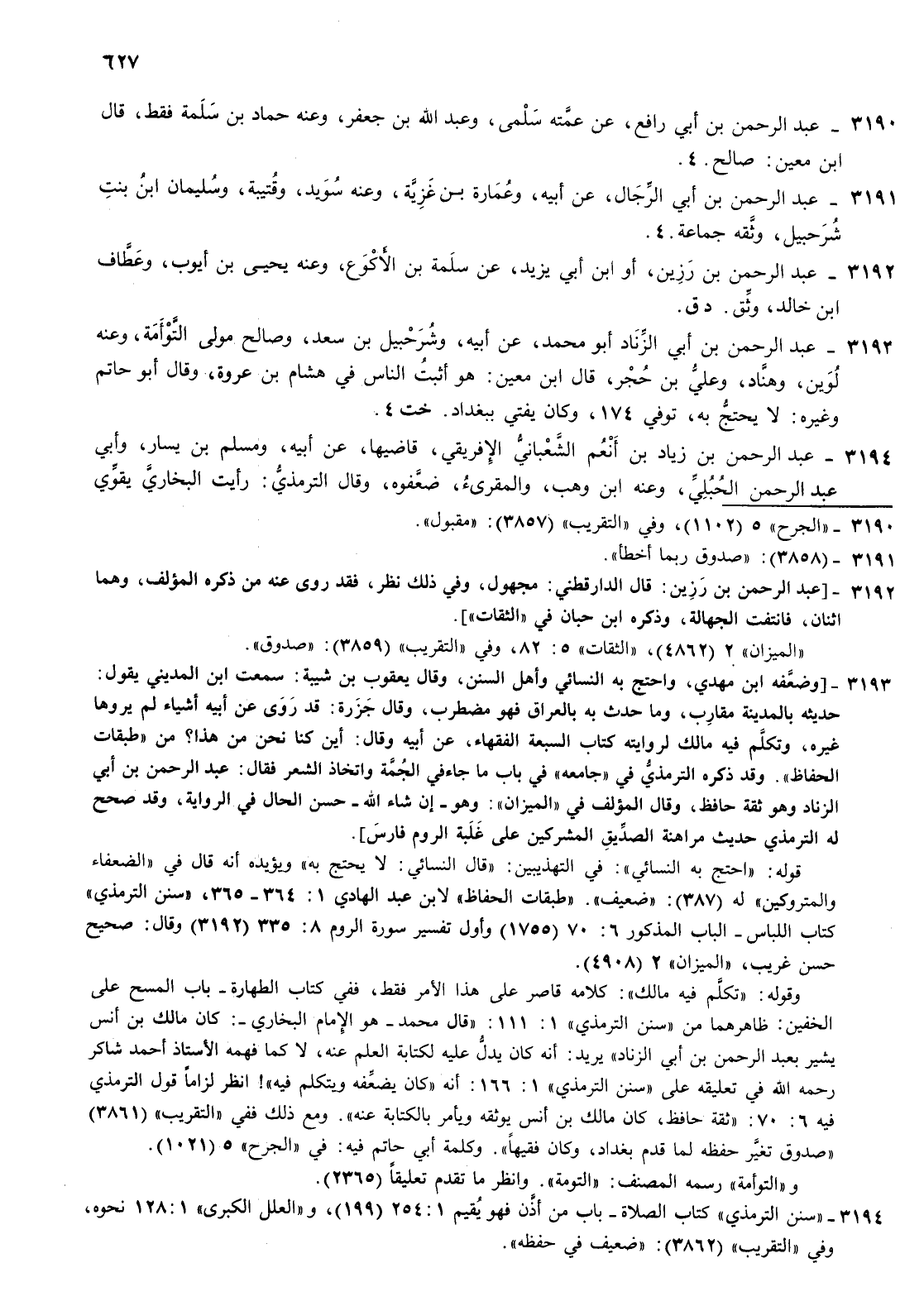 3191- عبد الرحمن بن أبي الرجال عن أبيه وعمارة بن غزية وعنه سويد وقتيبة وسليمان بن بنت شرحبيل وثقه جماعة 4