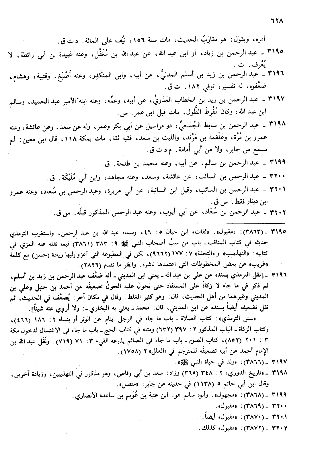 3196- عبد الرحمن بن زيد بن أسلم المدني عن أبيه وابن المنكدر وعنه أصبغ وقتيبة وهشام ضعفوه له تفسير توفي 182 ت ق