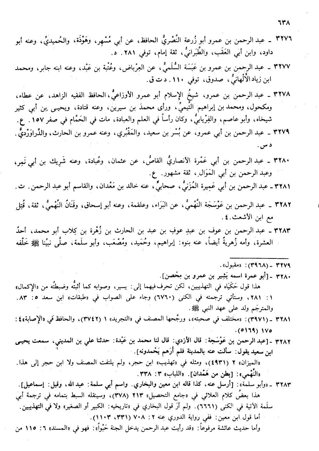 3278- عبد الرحمن بن عمرو شيخ الاسلام أبو عمرو الاوزاعي الحافظ الفقيه الزاهد عن عطاء ومكحول ومحمد بن إبراهيم التيمي ورأى محمد بن سيرين وعنه قتادة ويحيى بن أبي كثير شيخاه وأبو عاصم والفريابي وكان رأسا في العلم والعبادة مات في الحمام في صفر 157 ع