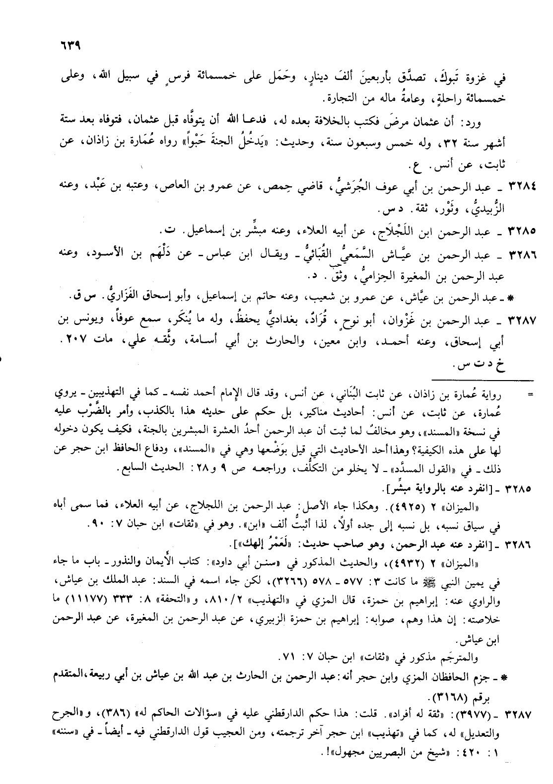 3287- عبد الرحمن بن غزوان أبو نوح قراد بغدادي يحفظ وله ما ينكر سمع عوفا ويونس بن أبي إسحاق وعنه أحمد وابن معين والحارث بن أبي أسامة وثقه علي مات 207 خ د ت س