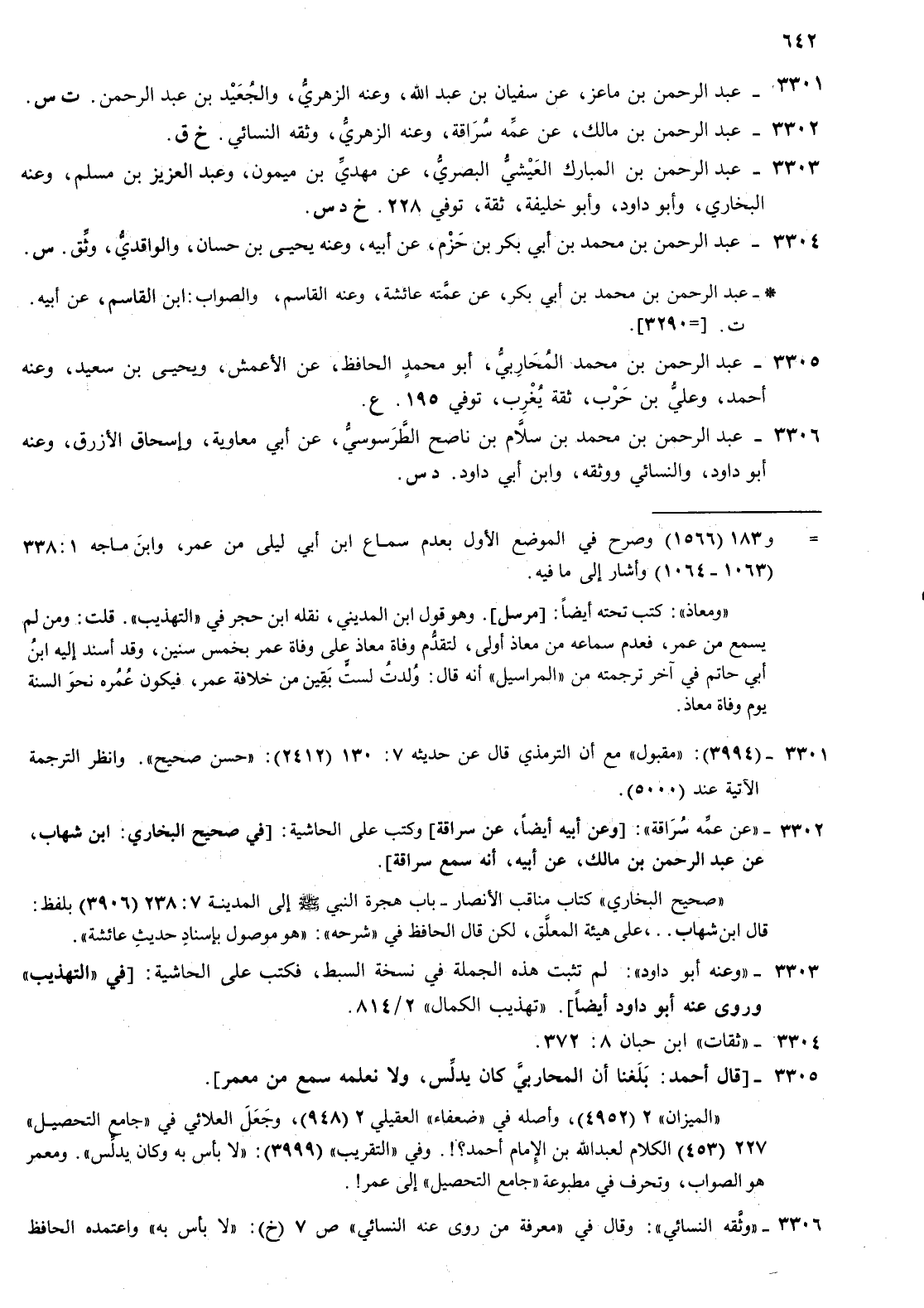 3305- عبد الرحمن بن محمد المحاربي أبو محمد الحافظ عن الاعمش ويحيى بن سعيد وعنه أحمد وعلي بن حرب ثقة يغرب توفي 195 ع