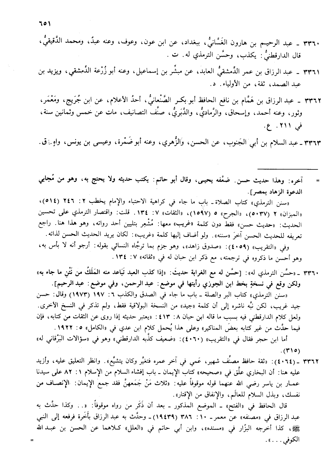 3362- عبد الرزاق بن همام بن نافع الحافظ أبو بكر الصنعاني أحد الاعلام عن بن جريج ومعمر وثور وعنه أحمد وإسحاق والرمادي والدبري صنف التصانيف مات عن خمس وثمانين سنة في 211 ع