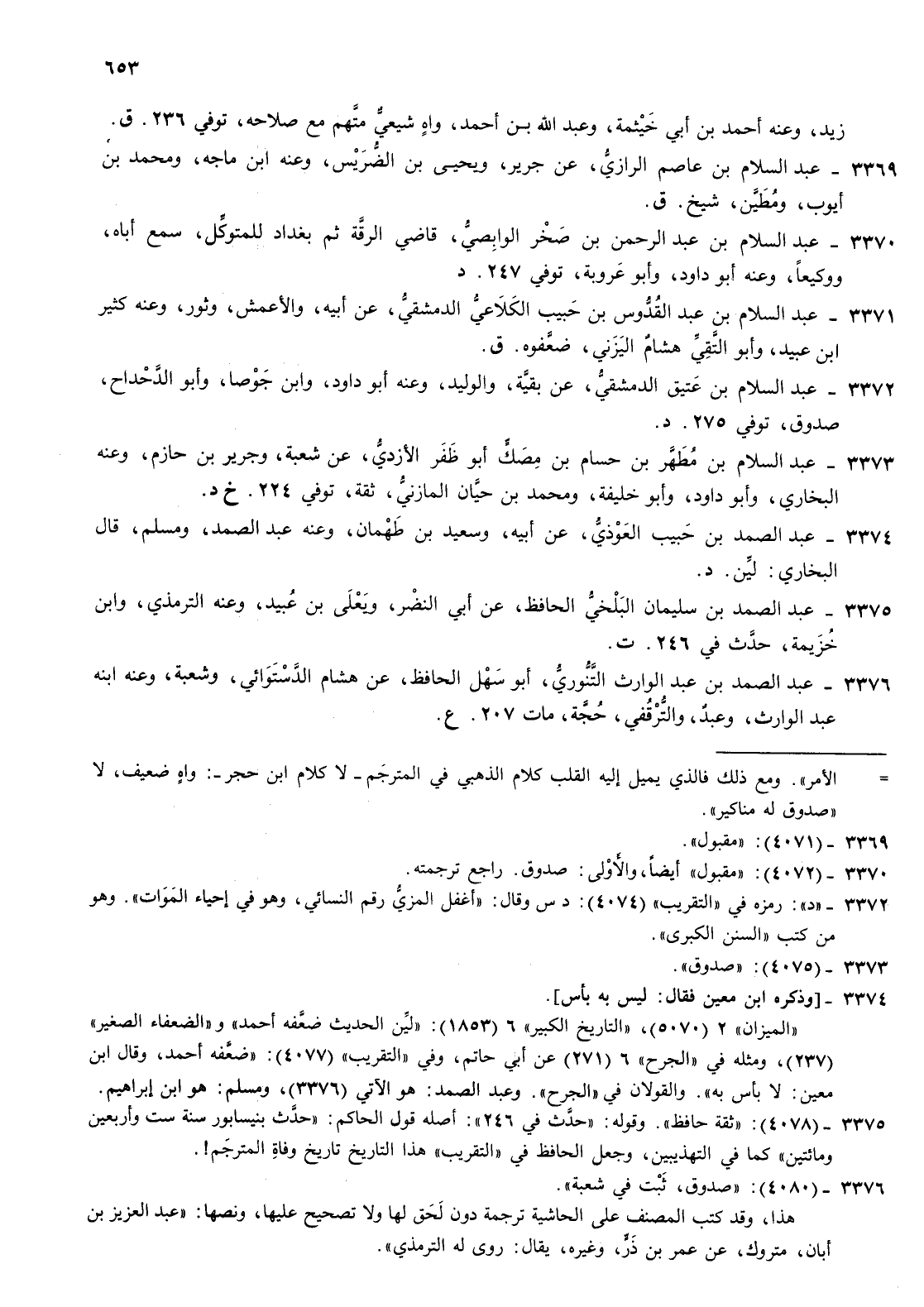 3370- عبد السلام بن عبد الرحمن بن صخر الوابصي قاضي الرقة ثم بغداد للمتوكل سمع أباه ووكيعا وعنه أبو داود وأبو عروبة توفي 247 د