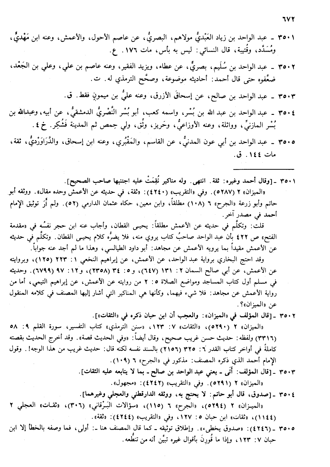 3501- عبد الواحد بن زياد العبدي مولاهم البصري عن عاصم الاحول والاعمش وعنه بن مهدي ومسدد وقتيبة قال النسائي ليس به بأس مات 176 ع