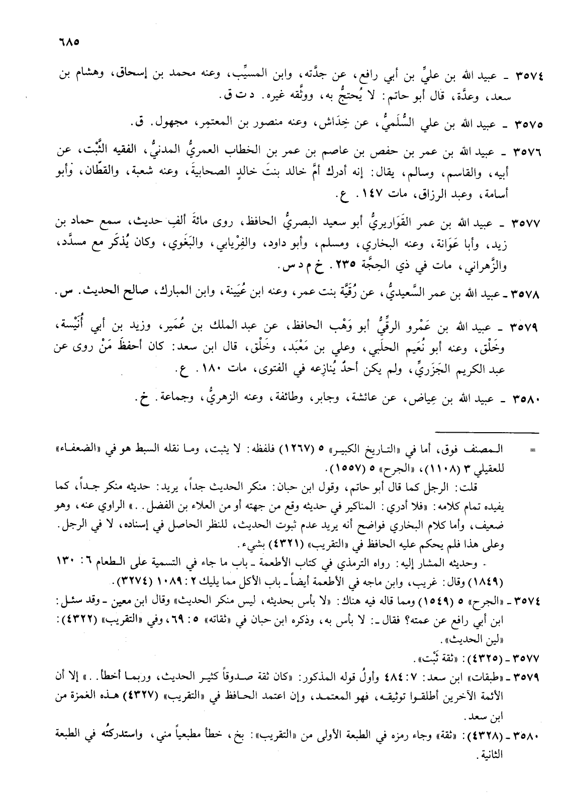 3574- عبيد الله بن علي بن أبي رافع عن جدته وابن المسيب وعنه محمد بن إسحاق وهشام بن سعد وعدة قال أبو حاتم لا يحتج به ووثقه غيره د ت ق