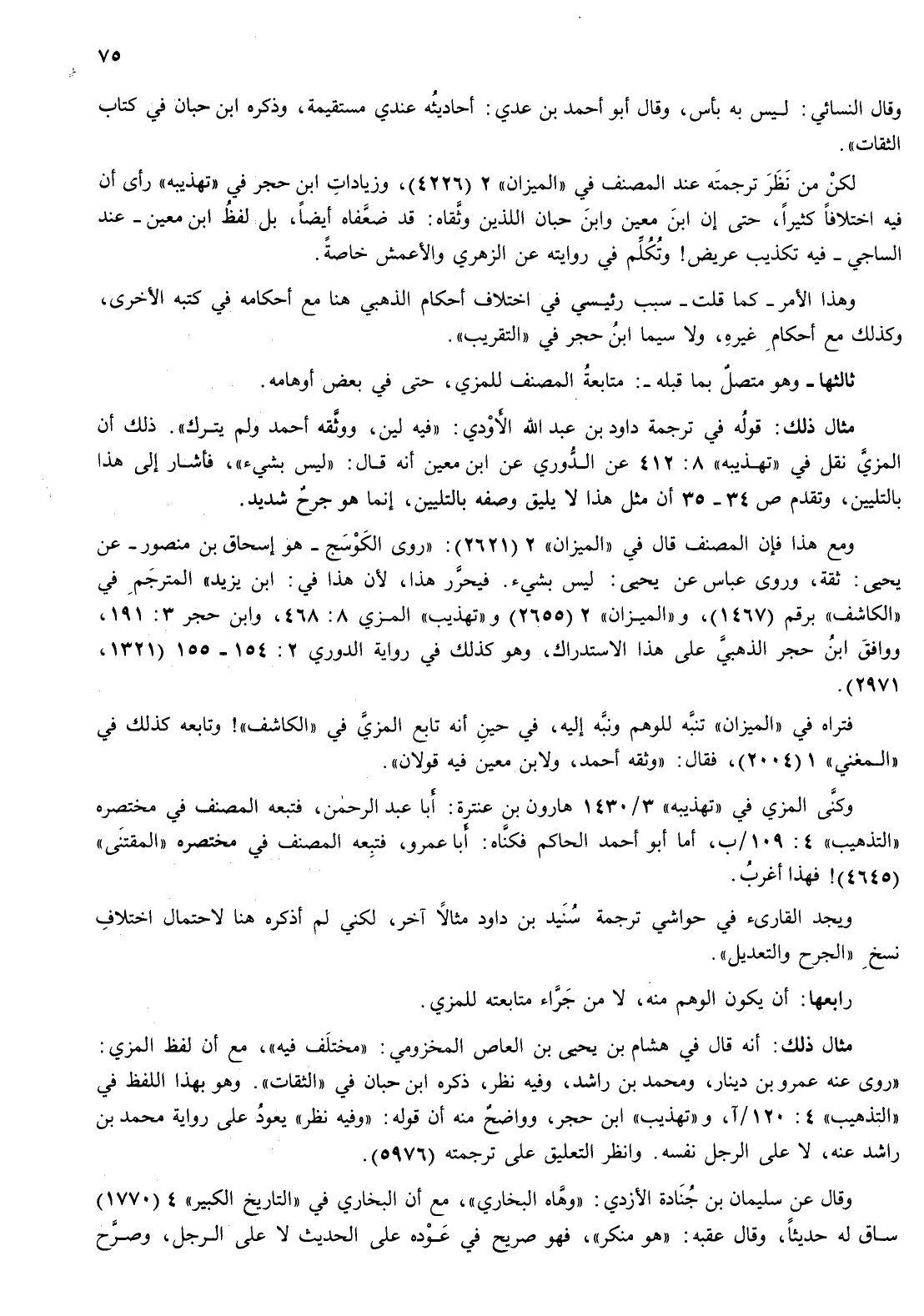 ويجد القارئ في حواشي ترجمة سنيد بن داود مثالا آخر، لكني لم أذكره هنا لاحتمال اختلاف نسخ " الجرح والتعديل ".