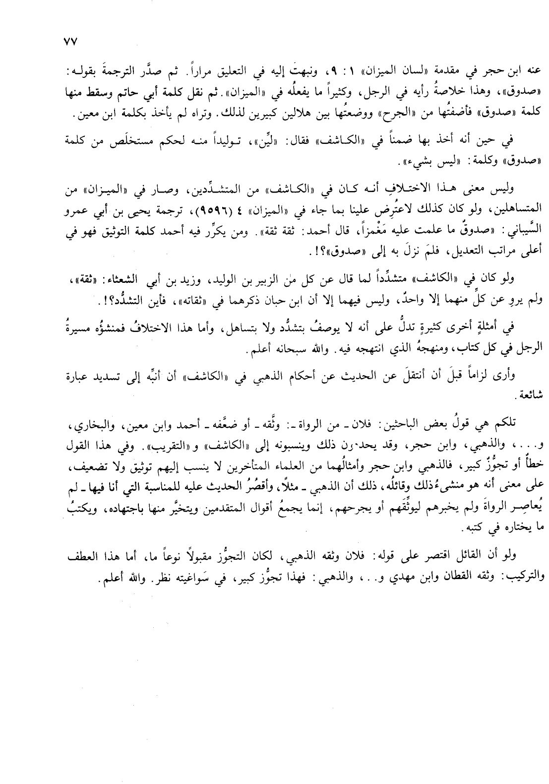 وليس معنى هذا الاختلاف أنه كان في " الكاشف " من المتشددين، وصار في " الميزان " من المتساهلين، ولو كان كذلك لاعتراض علينا بما جاء في " الميزان " 4