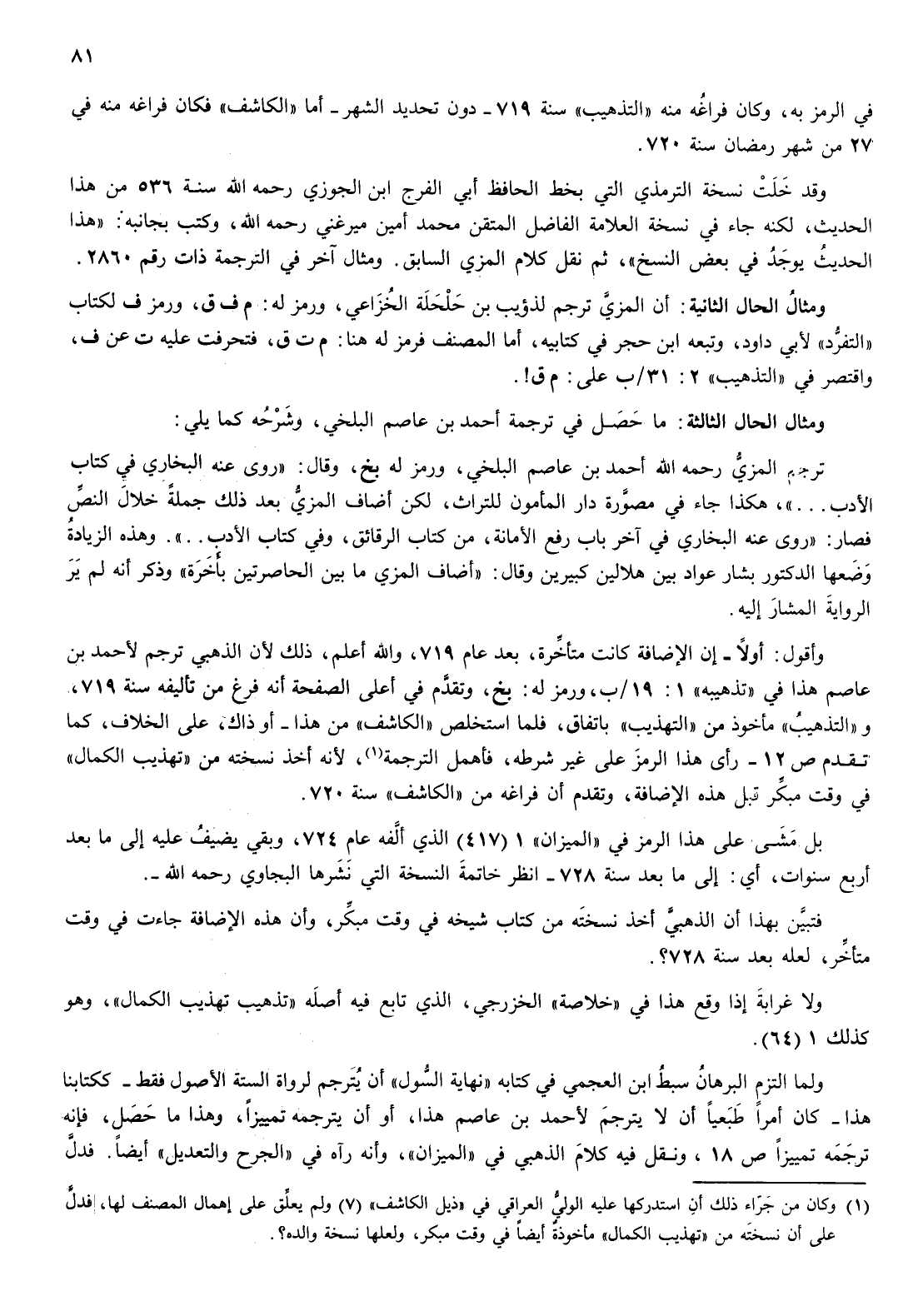 1) ، لانه أخذ نسخته من " تهذيب الكمال " في وقت مبكر قبل هذه الاضافة، وتقدم أن فراغه من " الكاشف " سنة 720.