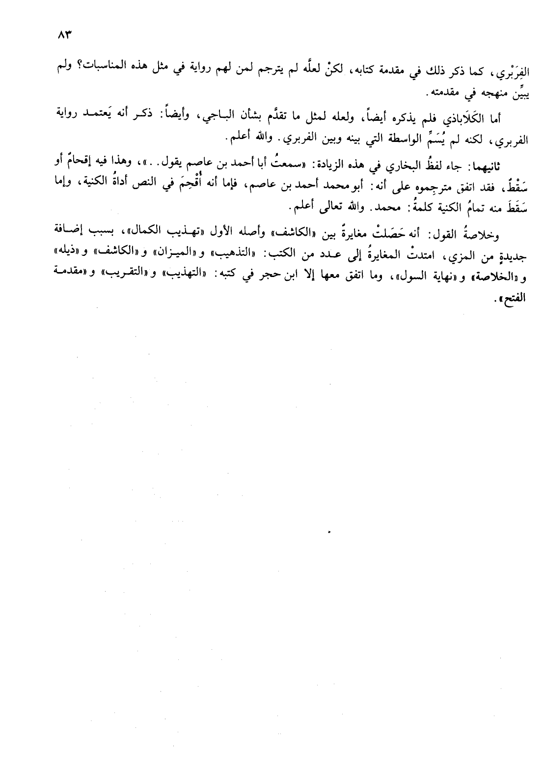 ثانيهما: جاء لفظ البخاري في هذه الزيادة: " سمعت أبا أحمد بن عاصم يقول.."، وهذا فيه إقحام أو سقط، فقد اتفق مترجموه على أنه: أبو محمد أحمد بن عاصم، فاما أنه أقحم في النص أداة الكنية، وإما سقط منه تمام الكنية كلمة: محمد.