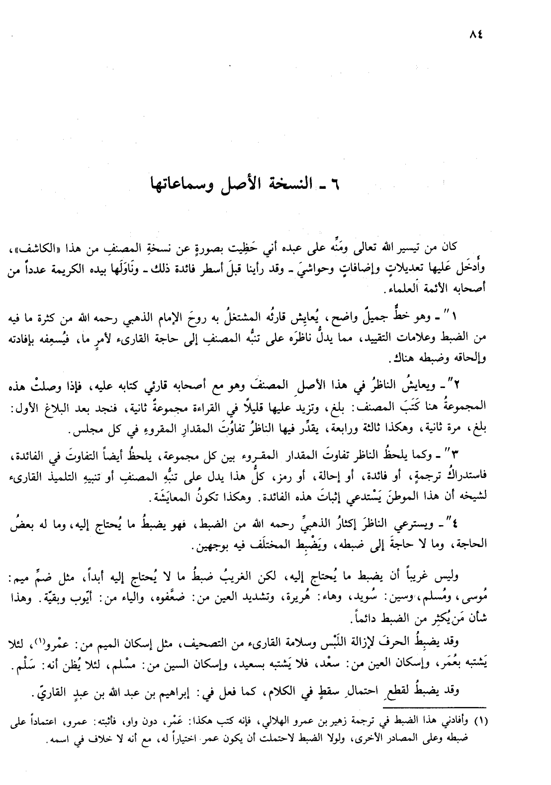 كان من تيسير الله تعالى ومنه على عبده أني حظيت بصورة عن نسخة المصنف من هذا " الكاشف "، وأدخل عليها تعديلات وإضافات وحواشي - وقد رأينا قبل أسطر فائدة ذلك - وناولها بيده الكريمة عددا من أصحابه الائمة العلماء.
