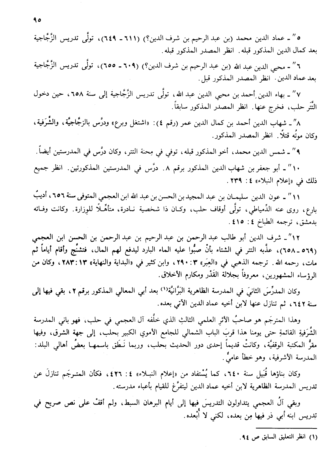 11 " - عون الدين سليمان بن عبد المجيد بن السحن بن عبد الله ابن العجمي المتوفى سنة 656، أديب بارع، روى عنه الدمياطي، تولى أوقاف حلب، وكان ذا شخصية نادرة، متاهلا للوزارة.