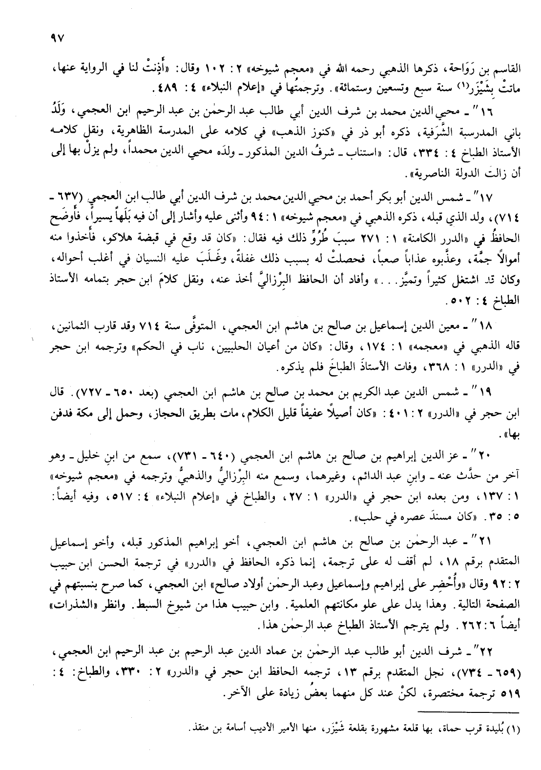 18 " - معين الدين گسماعيل بن صالح بن هاشم ابن العجمي، المتوفى سنة 714 وقد قارب الثمانين، قاله الذهبي في " معجمه " 1: 174، وقال: " كان من أعيان الحلبين، ناب في الحكم " وترجمه ابن حجر في " الدرر " 1: 368، وفات الاستاذ الطباخ فلم يذكره.