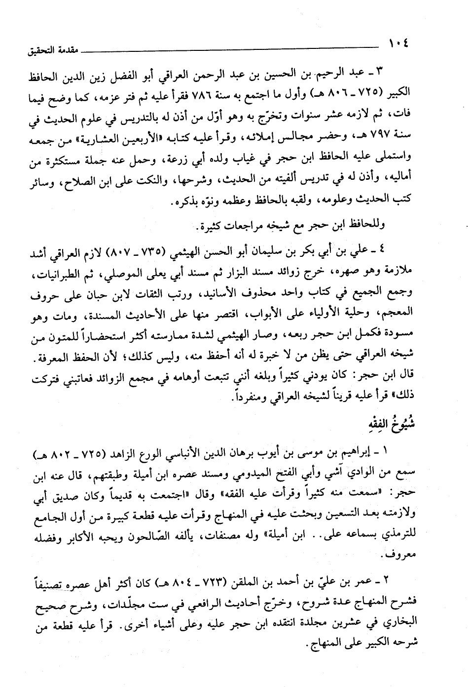 ٣- عبد الرحيم بن الحسين بن عبد الرحمن العراقي أبو الفضل زين الدين الحافظ الكبير (٧٢٥- ٨٠٦ هـ) وأول ما اجتمع به سنة ٧٨٦ فقرأ عليه ثم فتر عزمه، كما وضح فيما فات، ثم لازمه عشر سنوات وتخرّج به وهو أوّل من أذن له بالتدريس في علوم الحديث في سنة ٧٩٧ هـ، وحضر مجالس إملائه، وقرأ عليه كتابه «الأربعين العشارية» من جمعه واستملى عليه الحافظ ابن حجر في غياب ولده أبي زرعة، وحمل عنه جملة مستكثرة من أماليه، وأذن له في تدريس ألفيته من الحديث، وشرحها، والنكت على ابن الصلاح، وسائر كتب الحديث وعلومه، ولقبه بالحافظ وعظمه ونوّه بذكره.