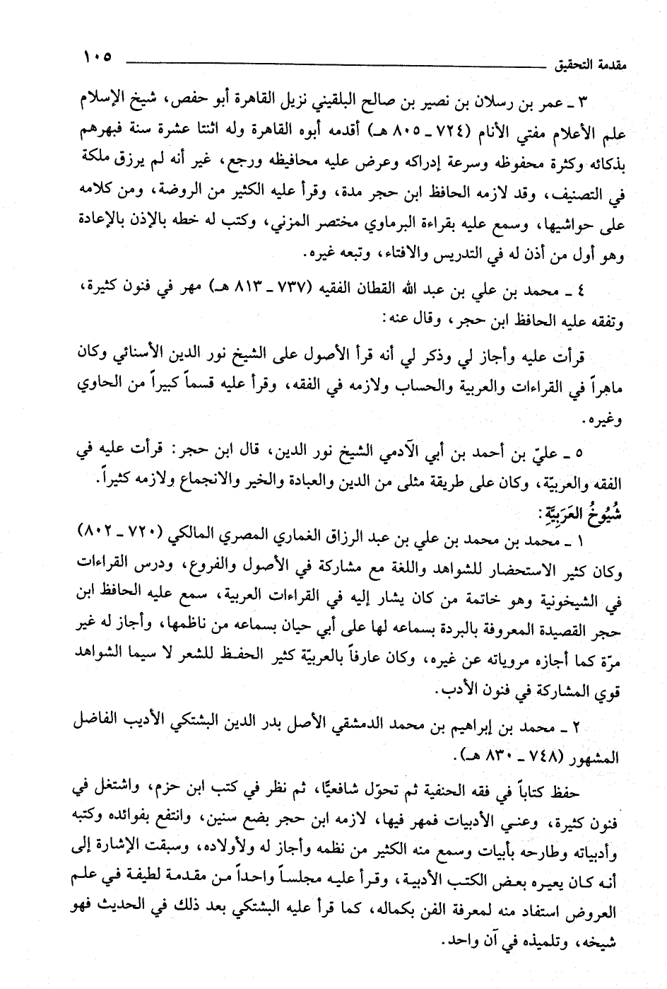 ٣- عمر بن رسلان بن نصير بن صالح البلقيني نزيل القاهرة أبو حفص، شيخ الإسلام علم الأعلام مفتي الأنام (٧٢٤- ٨٠٥ هـ) أقدمه أبوه القاهرة وله اثنتا عشرة سنة فبهرهم بذكائه وكثرة محفوظه وسرعة إدراكه وعرض عليه محافيظه ورجع، غير أنه لم يرزق ملكة في التصنيف، وقد لازمه الحافظ ابن حجر مدة، وقرأ عليه الكثير من الروضة، ومن كلامه على حواشيها، وسمع عليه بقراءة البرماوي مختصر المزني، وكتب له خطه بالإذن بالإعادة وهو أول من أذن له في التدريس والإفتاء، وتبعه غيره.