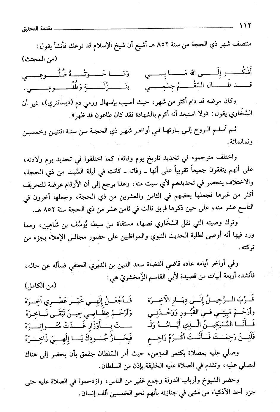 منتصف شهر ذي الحجة من سنة ٨٥٢ هـ أشيع أن شيخ الإسلام قد توعك فأنشأ يقول: