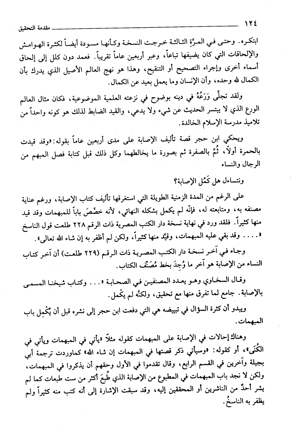 وهناك إحالات في الإصابة على المبهمات كقوله مثلا «يأتي في المبهمات ويأتي في الكنى» ، أو كقوله: «وسيأتي ذكر قصتها في المبهمات إن شاء اللَّه» كما وردت ترجمة أبي بجيلة وآخرين في القسم الرابع، وقال تقدموا في الأول وحقهم أن يذكروا في المبهمات، ولكن لا نجد باب المبهمات في المطبوع من الإصابة الّذي طبع أكثر من ست طبعات كما لم يشر أحد من الناشرين أو المحققين إليه، وقد سبقت الإشارة إلى أنه كتب منه كثيرا ولم يظفر به الناسخ.