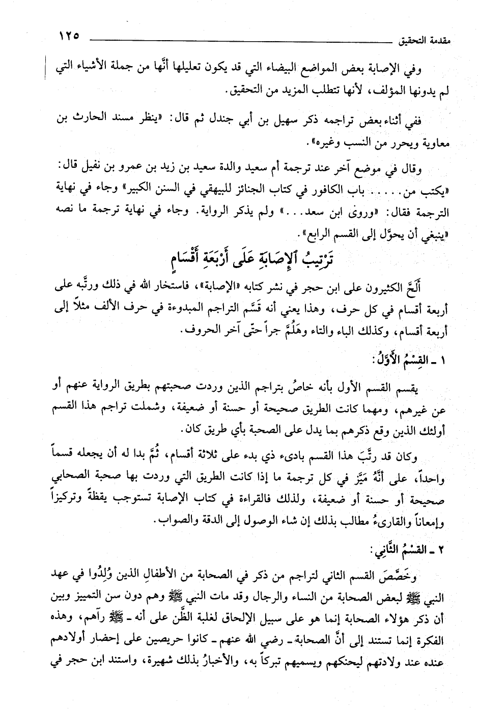 وكان قد رتّب هذا القسم بادئ ذي بدء على ثلاثة أقسام، ثمّ بدا له أن يجعله قسما واحدا، على أنّه ميّز في كل ترجمة ما إذا كانت الطريق التي وردت بها صحبة الصحابي صحيحة أو حسنة أو ضعيفة، ولذلك فالقراءة في كتاب الإصابة تستوجب يقظة وتركيزا وإمعانا والقارئ مطالب بذلك إن شاء الوصول إلى الدقة والصواب.