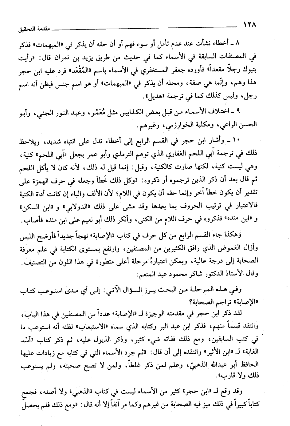 ١٠- وأشار ابن حجر في القسم الرابع إلى أخطاء تدل على انتباه شديد، ويلاحظ ذلك في ترجمة آبي اللحم الغفاريّ الّذي توهم الترمذي وأبو عمر بجعل «آبي اللحم» كنية، وهي ليست كنية، لكنها صارت كالكنية، وقيل: إنما قيل له ذلك، لأنه كان لا يأكل اللحم ثم قال بعد أن ذكر الذين ترجموه أو ذكروه: «وكل ذلك خطأ وجعله في حرف الهمزة على تقدير أن يكون خطأ آخر وإنما حقه أن يكون في اللام، لأن الألف والباء إن كانت أداة الكنية فالاعتبار في ترتيب الحروف بما بعدها وقد مشى على ذلك «الدولابي» و «ابن السكن» و «ابن مندة» فذكروه في حرف اللام من الكنى، وأنكر ذلك أبو نعيم على ابن مندة فأصاب.