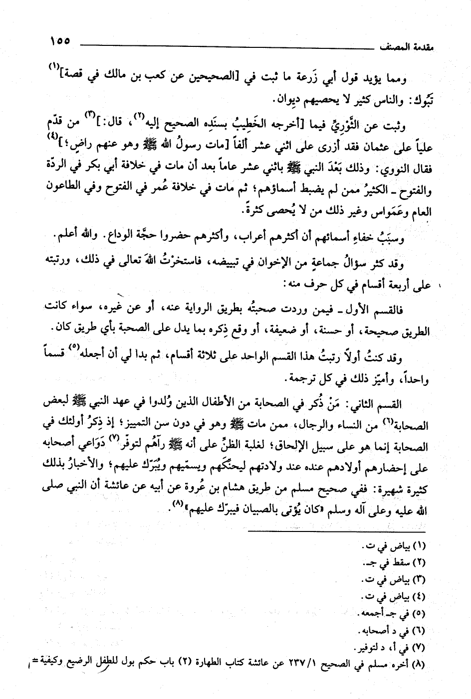 القسم الثاني: من ذكر في الصحابة من الأطفال الذين ولدوا في عهد النبي صلّى اللَّه عليه وسلم لبعض الصحابة [ (٦) ] من النساء والرجال، ممن مات صلّى اللَّه عليه وسلم وهو في دون سن التمييز، إذ ذكر أولئك في الصحابة إنما هو على سبيل الإلحاق، لغلبة الظنّ على أنه صلّى اللَّه عليه وسلم رآهم لتوفّر [ (٧) ] دواعي أصحابه على إحضارهم أولادهم عنده عند ولادتهم ليحنّكهم ويسمّيهم ويبرّك عليهم، والأخبار بذلك كثيرة شهيرة: ففي صحيح مسلم من طريق هشام بن عروة عن أبيه عن عائشة أن النبي صلّى اللَّه عليه وعلى آله وسلم «كان يؤتى بالصبيان فيبرّك عليهم» [ (٨) ] .