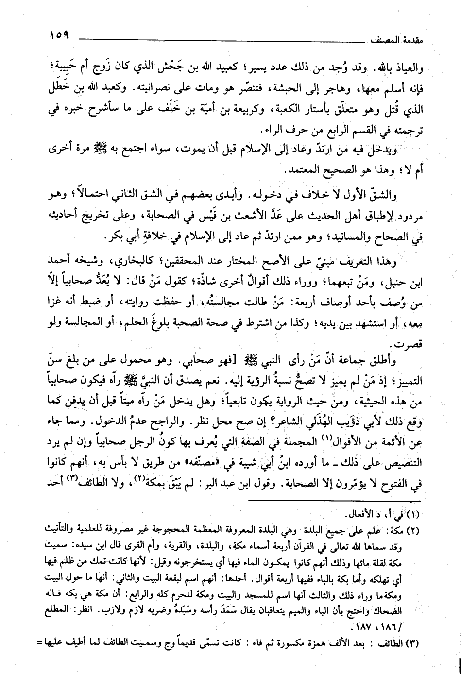 وأطلق جماعة أنّ من رأى النبي صلّى اللَّه عليه وسلم [فهو صحابي. وهو محمول على من بلغ سنّ التمييز، إذ من لم يميز لا تصحّ نسبة الرؤية إليه. نعم يصدق أن النبيّ صلّى اللَّه عليه وسلم رآه فيكون صحابيا من هذه الحيثية، ومن حيث الرواية يكون تابعيا، وهل يدخل من رآه ميتا قبل أن يدفن كما وقع ذلك لأبي ذؤيب الهذلي الشاعر؟ إن صح محل نظر. والراجح عدم الدخول. ومما جاء عن الأئمة من الأقوال [ (١) ] المجملة في الصفة التي يعرف بها كون الرجل صحابيا وإن لم يرد التنصيص على ذلك- ما أورده ابن أبي شيبة في «مصنّفه» من طريق لا بأس به، أنهم كانوا في الفتوح لا يؤمّرون إلا الصحابة. وقول ابن عبد البر: لم يبق بمكة [ (٢) ] ، ولا الطائف [ (٣) ] أحد