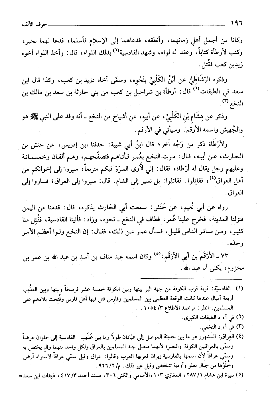 ولأرطاة ذكر من وجه آخر، قال ابن أبي شيبة: حدثنا ابن إدريس، عن حنش بن الحارث، عن أبيه، قال: مرت النخع بعمر فأتاهم فتصفّحهم، وهم ألفان وخمسمائة وعليهم رجل يقال له أرطاة، فقال: إني لأرى السرو فيكم متربعا، سيروا إلى إخوانكم من أهل العراق [ (٤) ] ، فقاتلوا. فقاتلوا: بل نسير إلى الشام. قال: سيروا إلى العراق، فساروا إلى العراق.