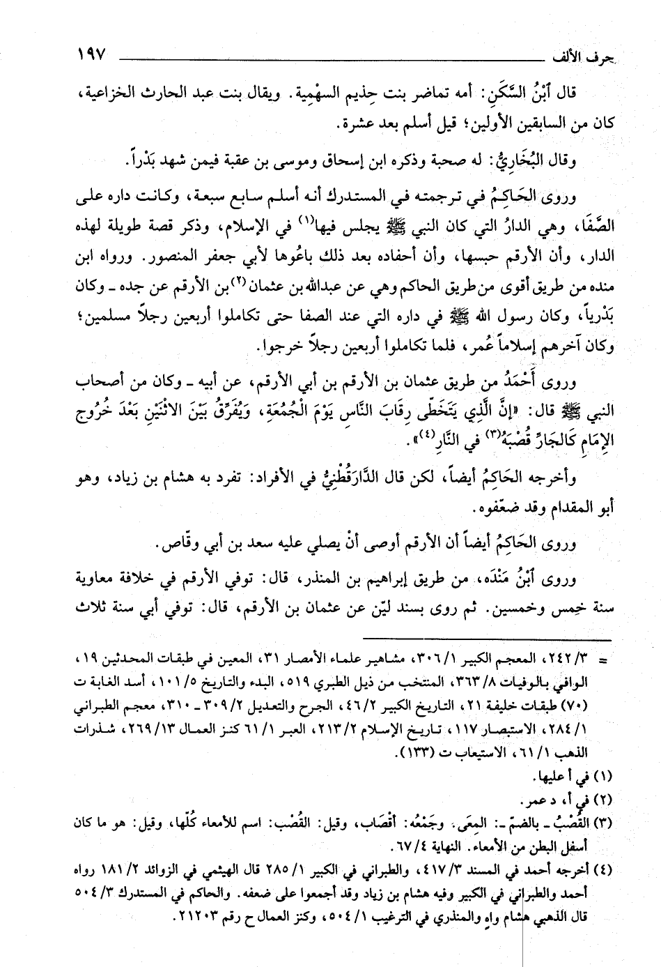 وروى الحاكم في ترجمته في المستدرك أنه أسلم سابع سبعة، وكانت داره على الصّفا، وهي الدار التي كان النبي صلّى اللَّه عليه وسلم يجلس فيها [ (١) ] في الإسلام، وذكر قصة طويلة لهذه الدار، وأن الأرقم حبسها، وأن أحفاده بعد ذلك باعوها لأبي جعفر المنصور. ورواه ابن مندة من طريق أقوى من طريق الحاكم وهي عن عبد اللَّه بن عثمان [ (٢) ] بن الأرقم عن جده- وكان بدريا، وكان رسول اللَّه صلّى اللَّه عليه وسلم في داره التي عند الصفا حتى تكاملوا أربعين رجلا مسلمين، وكان آخرهم إسلاما عمر، فلما تكاملوا أربعين رجلا خرجوا.