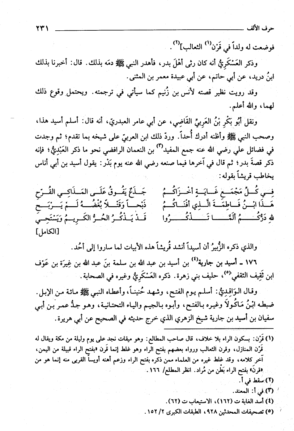 ونقل أبو بكر بن العربيّ القاضي، عن أبي عامر العبدريّ، أنه قال: أسلم أسيد هذا، وصحب النبي صلّى اللَّه عليه وسلم وأظنه أدرك أحدا. وردّ ذلك ابن العربيّ على شيخه بما تقدم، ثم وجدت في فضائل علي رضي اللَّه عنه جمع المفيد [ (٣) ] بن النعمان الرافضيّ نحو ما ذكر العبديّ، فإنه ذكر قصة بدر، ثم قال في آخرها فيما صنعه رضي اللَّه عنه يوم بدر: يقول أسيد بن أبي أناس يخاطب قريشا بقوله: