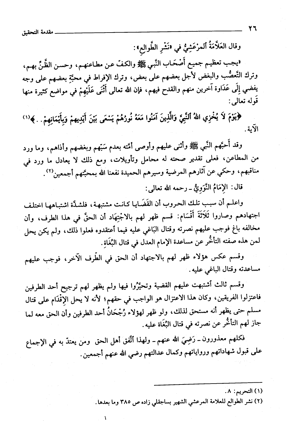 واعلم أن سبب تلك الحروب أن القضايا كانت مشتبهة، فلشدّة اشتباهها اختلف اجتهادهم وصاروا ثلاثة أقسام: قسم ظهر لهم بالاجتهاد أن الحقّ في هذا الطرف، وأن مخالفه باغ فوجب عليهم نصرته وقتال الباغي عليه فيما اعتقدوه فعلوا ذلك، ولم يكن يحل لمن هذه صفته التأخّر عن مساعدة الإمام العدل في قتال البغاة.