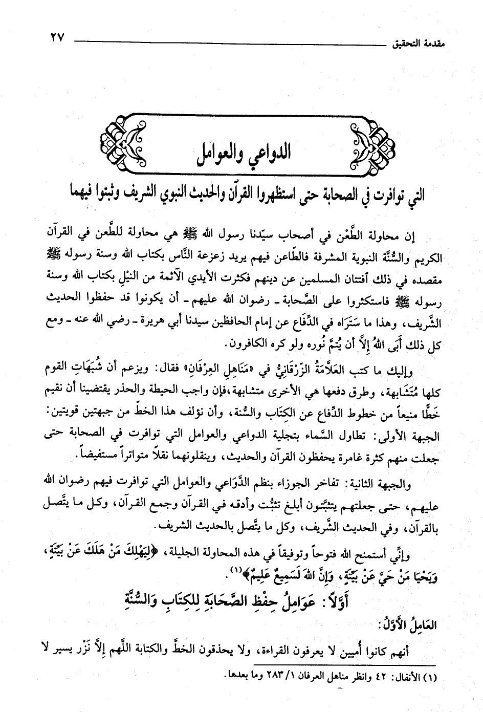 الجبهة الأولى: تطاول السّماء بتجلية الدواعي والعوامل التي توافرت في الصحابة حتى جعلت منهم كثرة غامرة يحفظون القرآن والحديث، وينقلونهما نقلا متواترا مستفيضا.