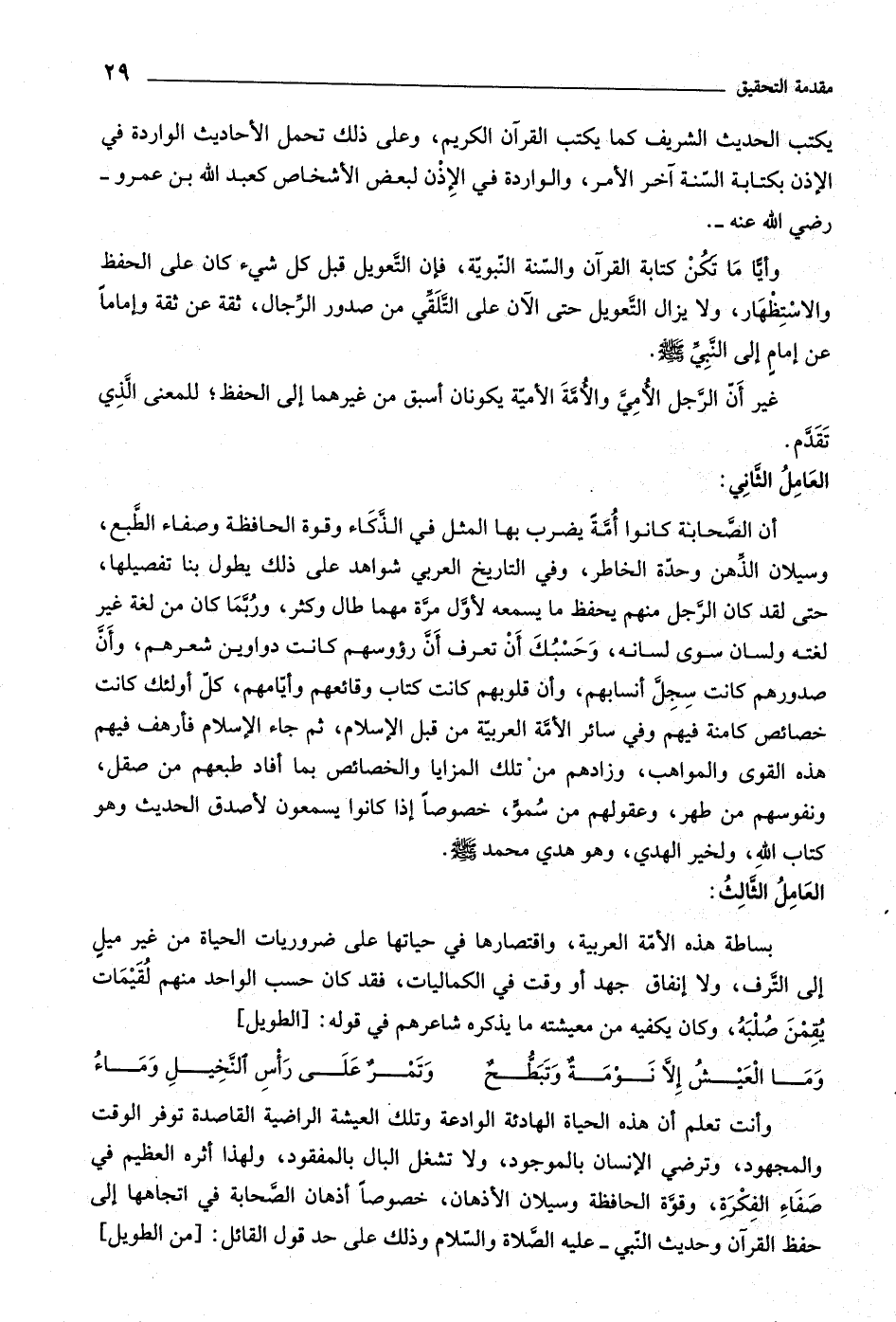 وأنت تعلم أن هذه الحياة الهادئة الوادعة وتلك العيشة الراضية القاصدة توفر الوقت والمجهود، وترضي الإنسان بالموجود، ولا تشغل البال بالمفقود، ولهذا أثره العظيم في صفاء الفكرة، وقوّة الحافظة وسيلان الأذهان، خصوصا أذهان الصّحابة في اتجاهها إلى حفظ القرآن وحديث النّبي- عليه الصّلاة والسّلام وذلك على حد قول القائل: [من الطويل]