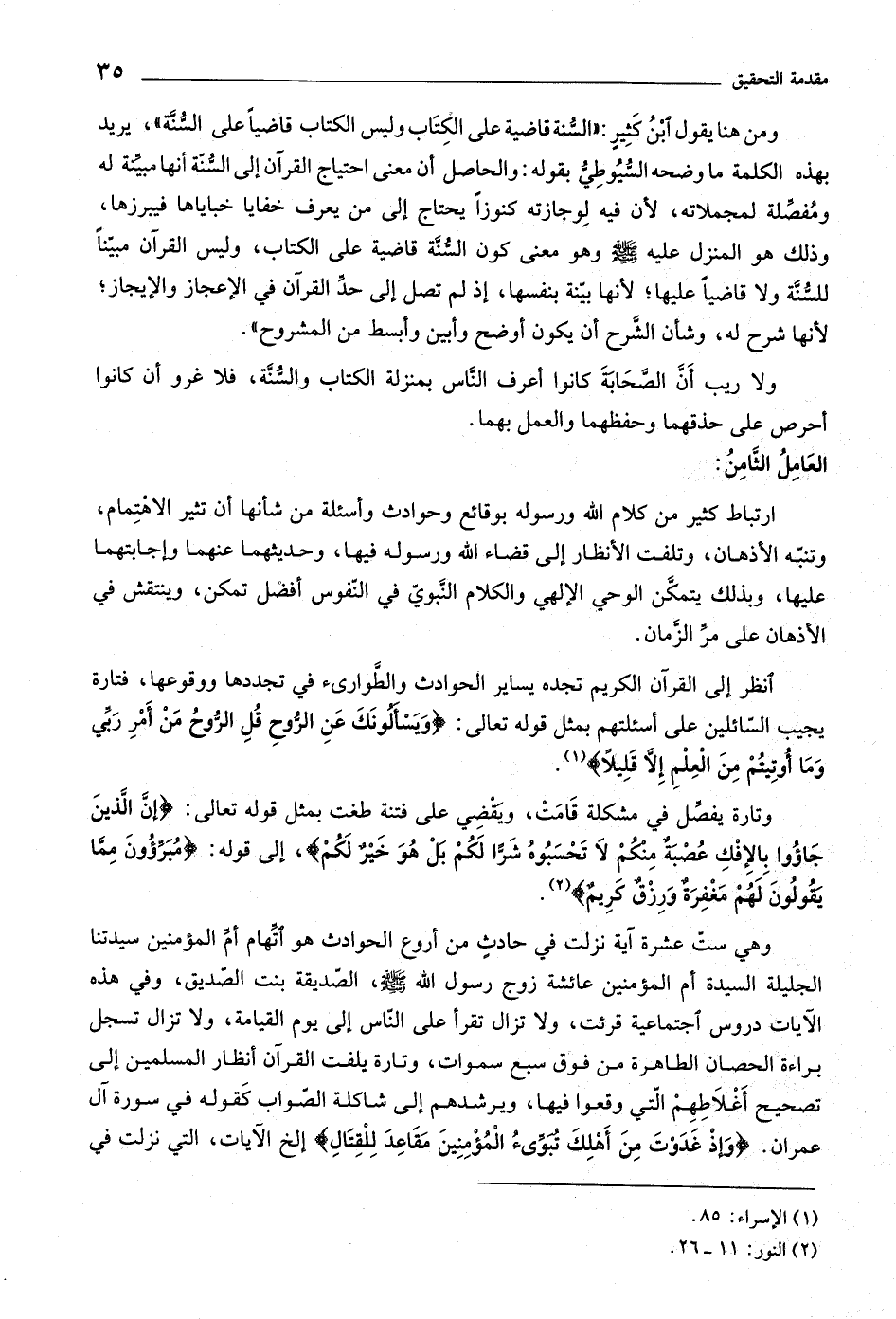 وتارة يفصّل في مشكلة قامت، ويقضي على فتنة طغت بمثل قوله تعالى: إِنَّ الَّذِينَ جاؤُ بِالْإِفْكِ عُصْبَةٌ مِنْكُمْ لا تَحْسَبُوهُ شَرًّا لَكُمْ بَلْ هُوَ خَيْرٌ لَكُمْ، إلى قوله: مُبَرَّؤُنَ مِمَّا يَقُولُونَ لَهُمْ مَغْفِرَةٌ وَرِزْقٌ كَرِيمٌ [ (٢) ] .