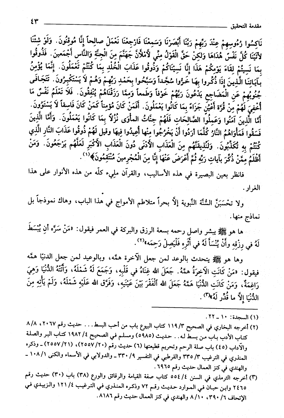 [ (٣) ] أخرجه الترمذي في السنن ٤/ ٥٥٤ كتاب صفة القيامة والرقائق والورع (٣٨) باب (٣٠) حديث رقم ٢٤٦٥ وابن حبان في الموارد حديث رقم ٧٢ وذكره المنذري في الترغيب ٤/ ١٢١ والزبيدي في الإتحاف ٦/ ٣٩٠، ١٠/ ٨ والهندي في كنز العمال حديث رقم ٨١٨٦.