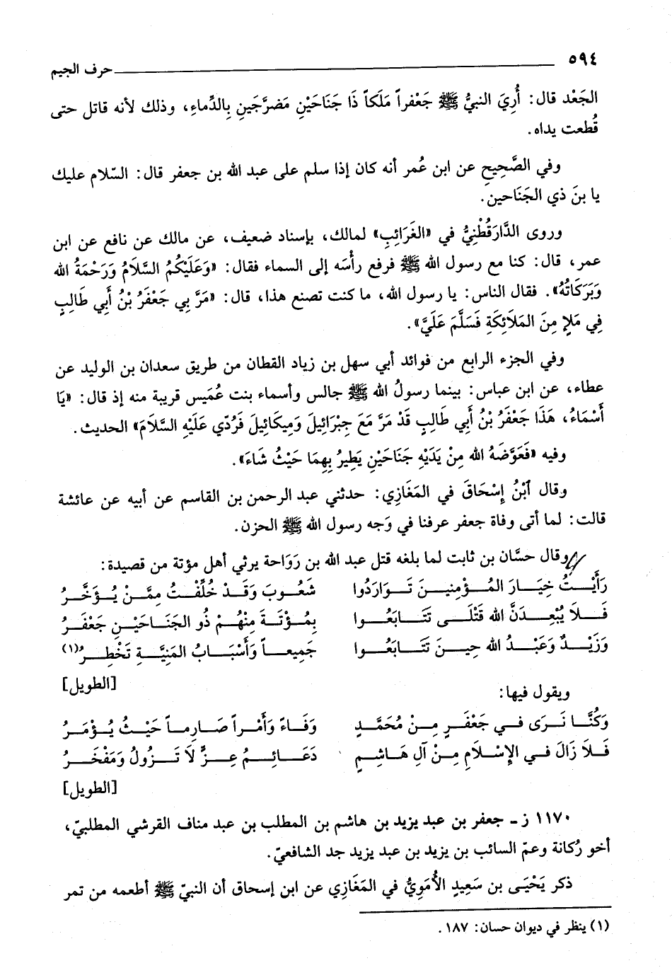 وفي الصّحيح عن ابن عمر أنه كان إذا سلم على عبد اللَّه بن جعفر قال: السّلام عليك يا بن ذي الجناحين.