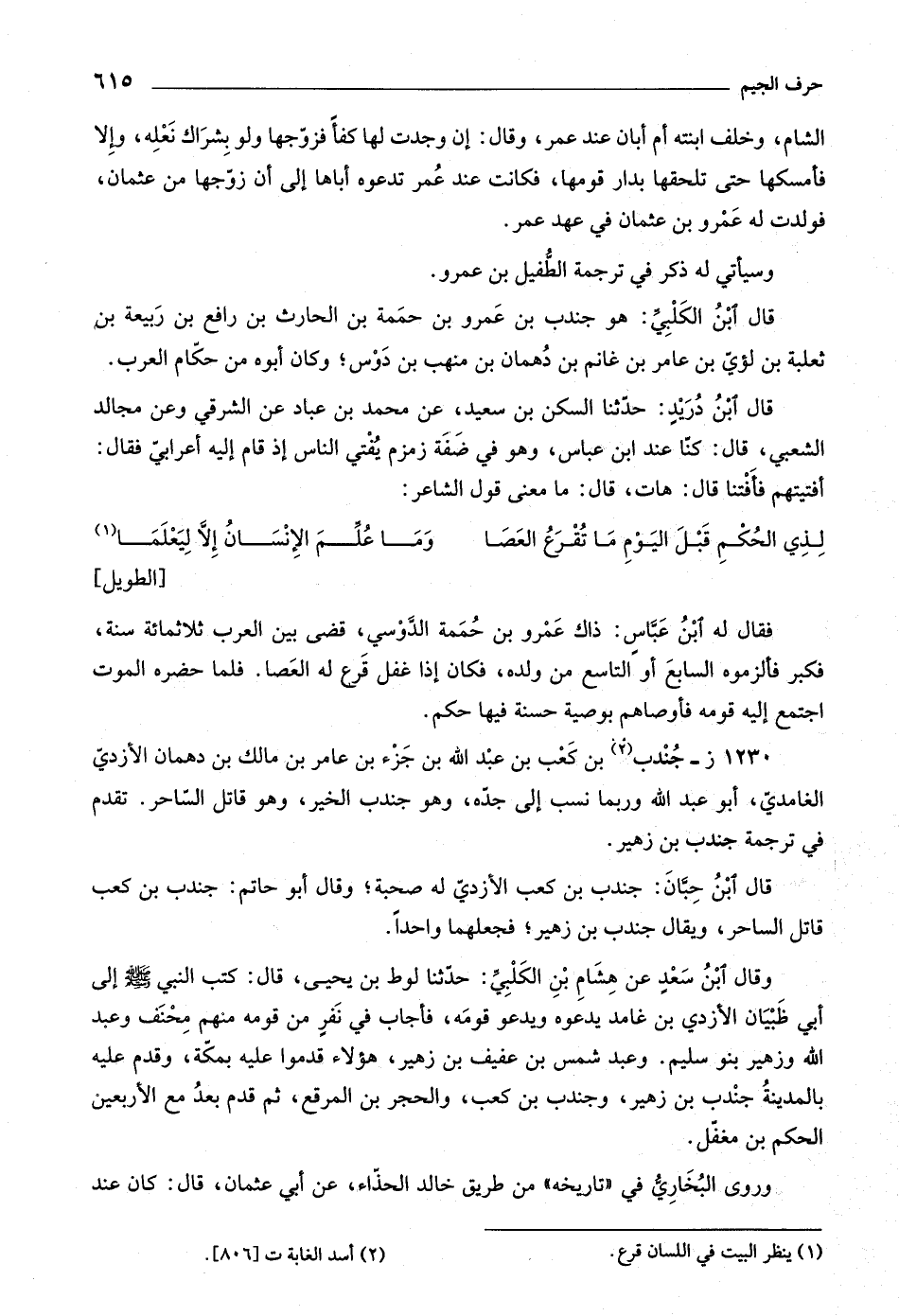 [الطويل] فقال له ابن عبّاس: ذاك عمرو بن حممة الدّوسي، قضى بين العرب ثلاثمائة سنة، فكبر فألزموه السابع أو التاسع من ولده، فكان إذا غفل قرع له العصا. فلما حضره الموت اجتمع إليه قومه فأوصاهم بوصية حسنة فيها حكم.