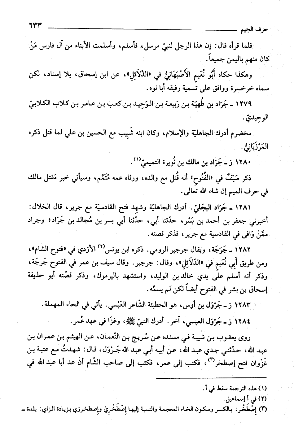 روى يعقوب بن شيبة في مسندة عن سريج بن النّعمان، عن الهيثم بن عمران بن عبد اللَّه، حدّثني جدي عبد اللَّه، عن أبيه أبي عبد اللَّه جرول، قال: شهدت مع عتبة بن غزوان فتح إصطخر [ (٣) ] ، فكتب إلى عمر، فكتب إلى صاحب الشّام أن عد أبا عبد اللَّه في